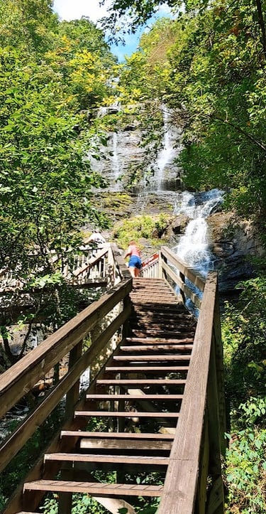 The final descent to Conasauga Falls has stones steps which I'm guessing are supposed to help with traction over the loose gravel, and in most cases it works. To be honest, I was slightly disappointed in the falls - but here's my 2 cents: You know they're going to be full roaring gorgeous if you go in the spring or early summer. Not mid-September like we did. t's still a beautiful area - just out in the middle of a lush forest. It could almost be a scene right out of the Jungle Book.